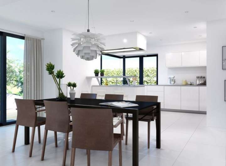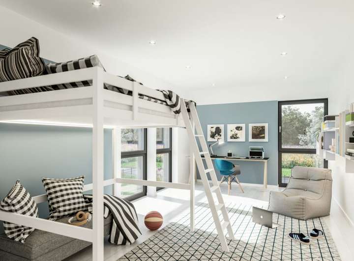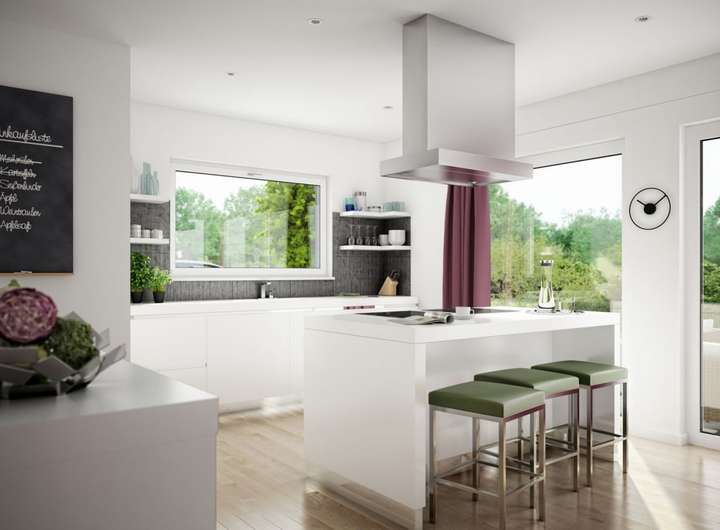Im Inneren entpuppt sich das EVOLUTION 177 als Wohntraum für größere Familien: Bei rund 176 Quadratmetern bleibt kein Wunsch offen. Den Mittelpunkt aller gemeinschaftlichen Aktivitäten bildet der große, offene Wohn-Ess-Kochbereich im Erdgeschoss, der durch üppige Glasflächen in ein sonniges Ambiente getaucht wird. Ruhe und Privatsphäre für ein entspanntes Familienleben finden die Bewohner im Obergeschoss mit gleich fünf Schlafzimmern und zwei Bädern. Und sollte noch mehr Platz gewünscht sein, vergrößern Sie den Grundriss ganz einfach durch eine oder mehrere Wohnraumerweiterungen.