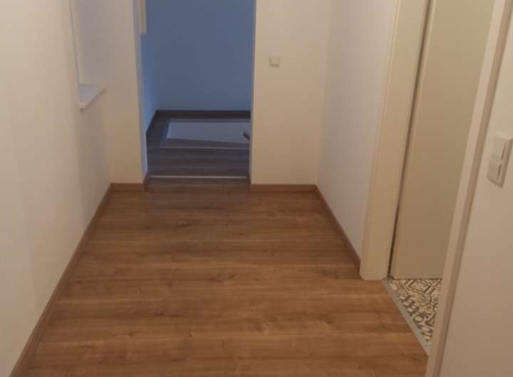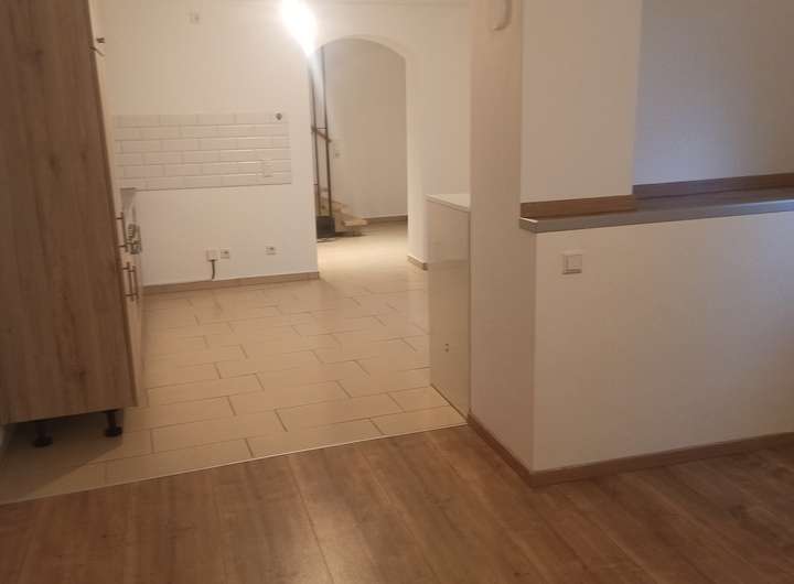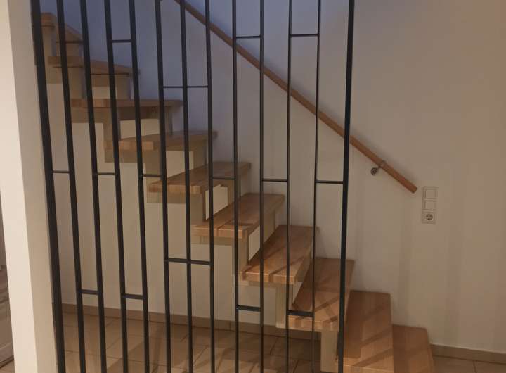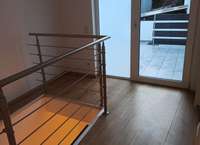 Was hat circa 88 m² und eine Terrasse und einen eigenen Eingang. Im Untergeschoss ist ein Wohnzimmer, Küche, Badezimmer und im Obergeschoss ein Schlafzimmer, Badezimmer und Terrasse.