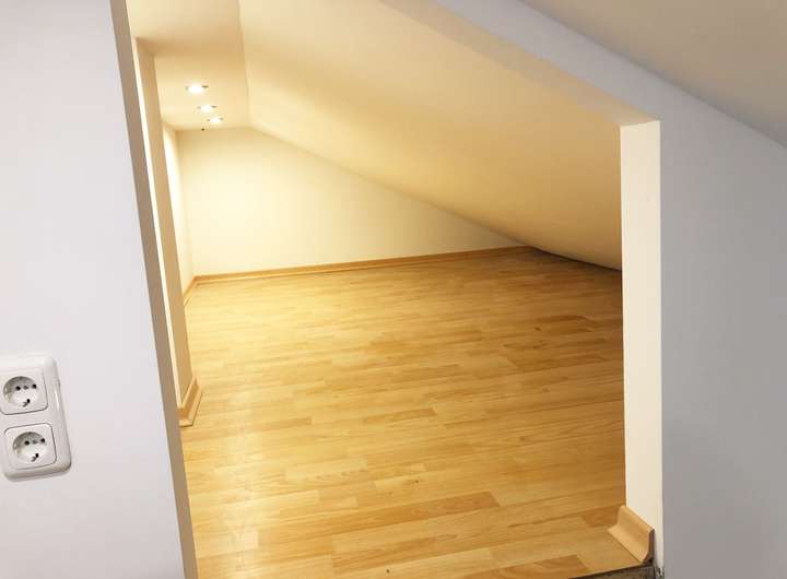 Über eine offene Wendeltreppe gelangt man in das Obergeschoss, in dem sich zwei Schlafzimmer sowie ein Duschbad befinden. Ein Schlafzimmer verfügt über eine höhere Raumhöhe mit Schlafempore und direktem Zugang zur Dachterrasse.