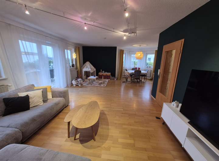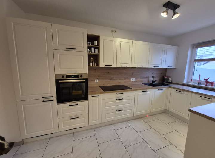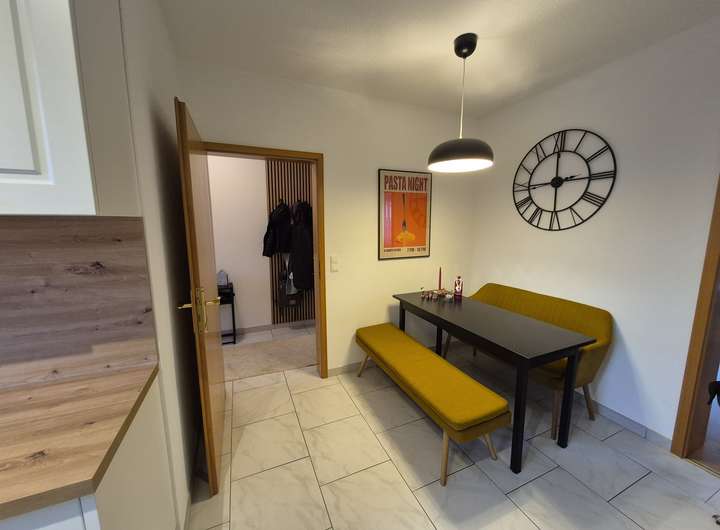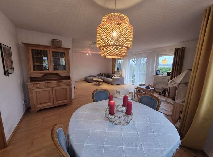 Das Erdgeschoss verfügt über ein Gäste-WC, eine neue Landhausküche aus dem Jahr 2023 sowie ein großzügiges, ca. 39 m² großes Wohn- und Esszimmer mit direktem Zugang zum Garten.