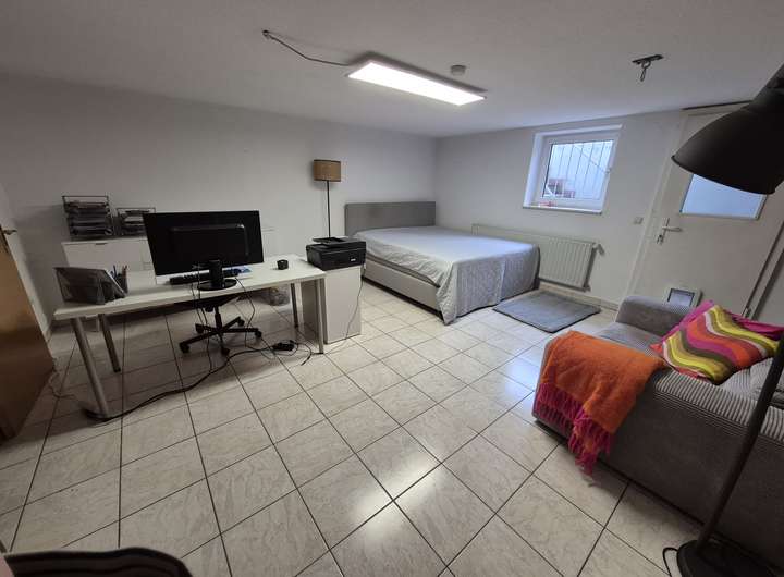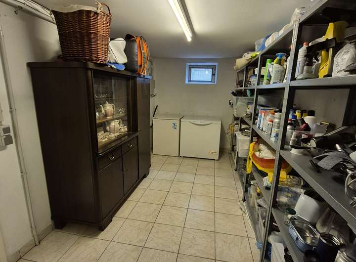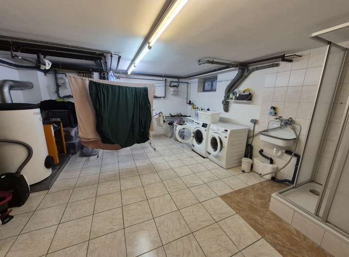 Der vollständig geflieste Keller ist wohnraumähnlich gestaltet und eröffnet zahlreiche Nutzungsmöglichkeiten. Hier befinden sich ein Waschraum mit zusätzlicher Dusche, zwei kleinere Räume sowie ein großer Raum mit Außentreppe zum Garten, der sich ideal als Gästezimmer, Büro oder Hobbyraum eignet.