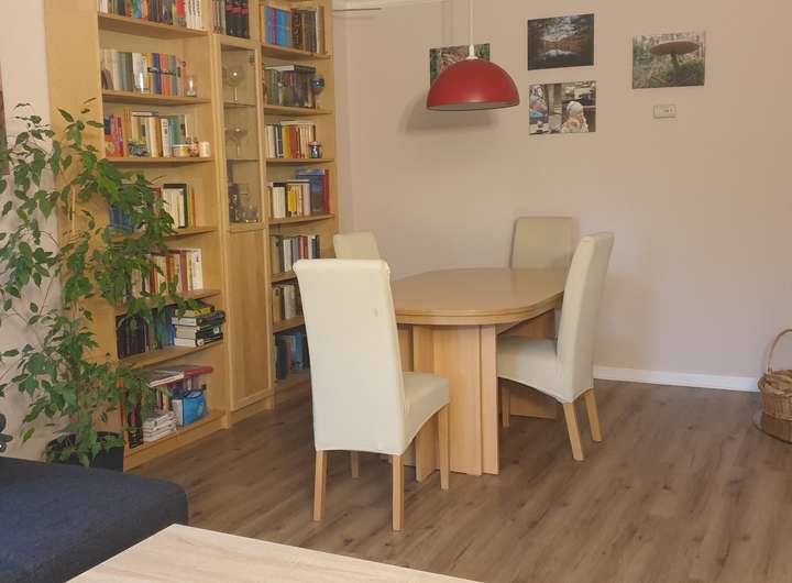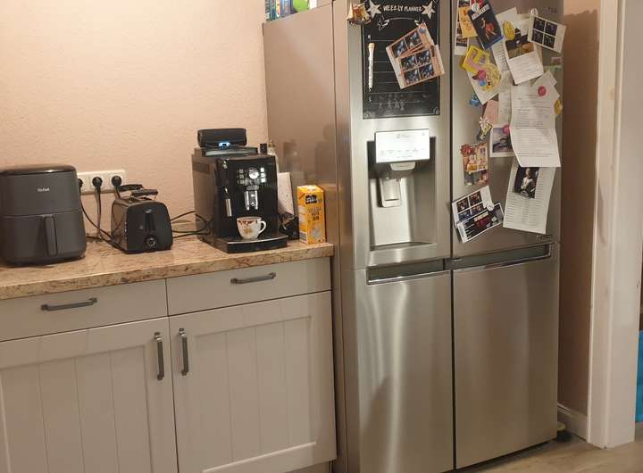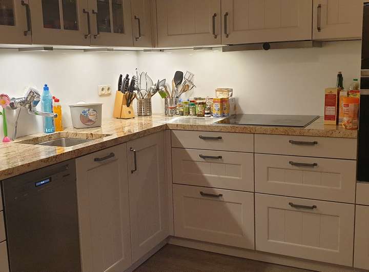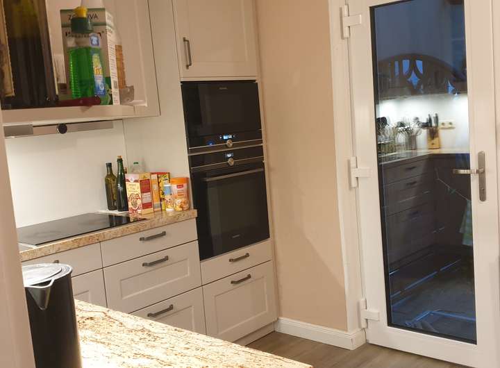 Die Küche verfügt über einen Backofen mit Selbstreinigungsfunktion, eine eingebaute Mikrowelle, einen Herd mit Ceranfeld und Induktion, sowie eine kleine Geschirrspühlmaschine (für 4 Personen ausreichend). Genügend Stauraum für Lebensmittel und Geschirr. Der Kühlschrank, der auf den Bildern zu sehen ist, wird NICHT mit vermietet.