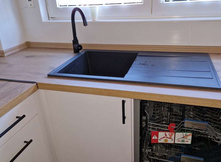 Amerikanische Küche: Neue Einbauküche mit Markengeräten (Backofen, Spülmaschine, Dunstabzugshaube). Kühlschrank ist mieterseits mitzubringen.