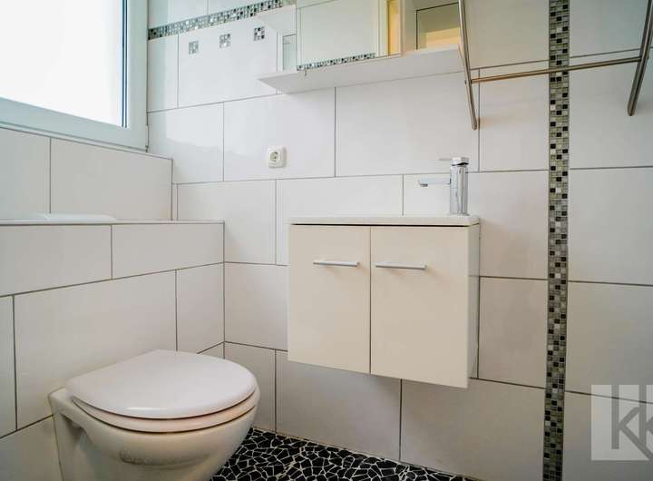 Beim Betreten des Hauses befindet sich zur linken Seite ein Gäste-WC mit Dusche – praktisch und alltagstauglich. Rechter Hand liegt die separate Küche, die durch ihre klassische Abtrennung verhindert, dass sich Kochgerüche im gesamten Wohnbereich ausbreiten. Weiter im Flur öffnet sich der Blick in den Essbereich, der mit seiner hohen Decke und dem Blick auf eine kleine Galerie beeindruckt und dem Haus eine angenehme Großzügigkeit verleiht.