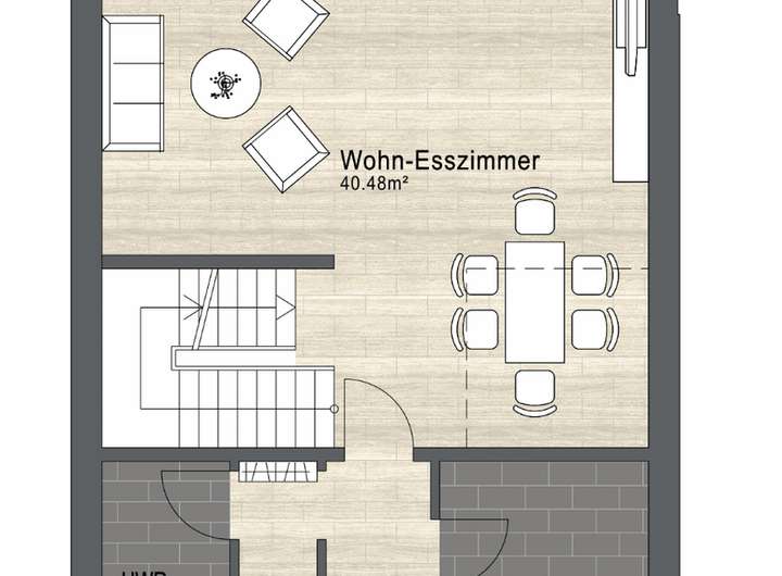 Im Erdgeschoss befindet sich zudem ein Hauswirtschaftsraum, in dem die Hausanschlüsse untergebracht sind und der zusätzlichen Stauraum für den Alltag schafft.