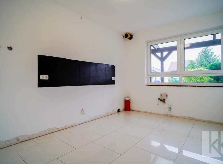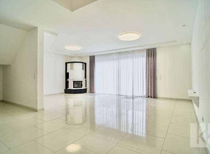 Wohnen und Essen gehen fließend ineinander über und bilden den Mittelpunkt des familiären Zusammenlebens. Ein großer Kamin sorgt für eine behagliche Atmosphäre und lädt zu gemütlichen Stunden ein. Von hier aus gelangt man auf die Terrasse und in den kleinen, geschützten Garten, der Raum für Entspannung und Erholung im Freien bietet.