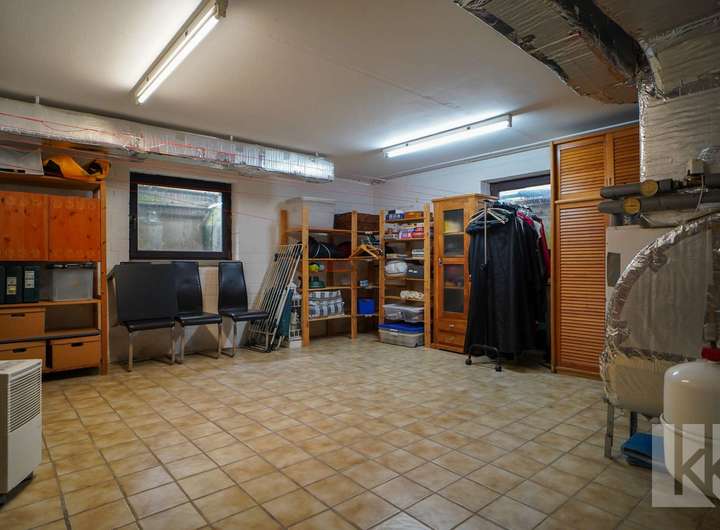 Der Keller ist ebenfalls auf zwei Ebenen aufgeteilt: Der obere Bereich bietet einen wohnlich ausgebauten Teil mit Bad und zwei hellen, flexibel nutzbaren Räumen, ehemals gewerblich genutzt. Im unteren Bereich befinden sich Hausanschlüsse, Werkstatt und Lagerräume.