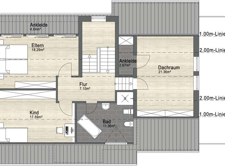 Über die erste Treppe erreichen Sie ein Split-Level mit einem separaten Wohnbereich, der sich ideal als Einliegerwohnung eignet: Ein Flur verbindet das Duschbad mit Fenster, ein Schlafzimmer sowie einen Bereich, der als offene Wohnküche gestaltet werden kann.