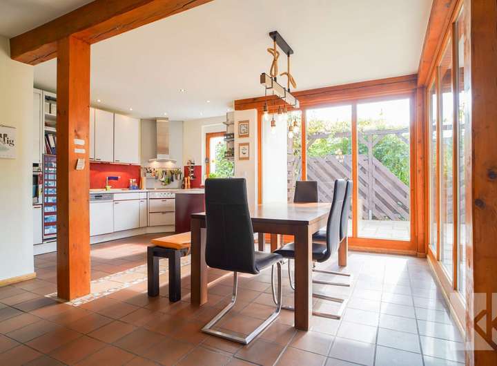 Der Eingangsbereich bietet Platz für eine Garderobe und führt zentral in alle Ebenen des Hauses. Auf der linken Seite gelangen Sie in den Wohn- und Essbereich, wo ein Kaminofen für behagliche Wärme sorgt. Große Fensterflächen lassen viel Tageslicht herein und öffnen den Zugang zur Terrasse.