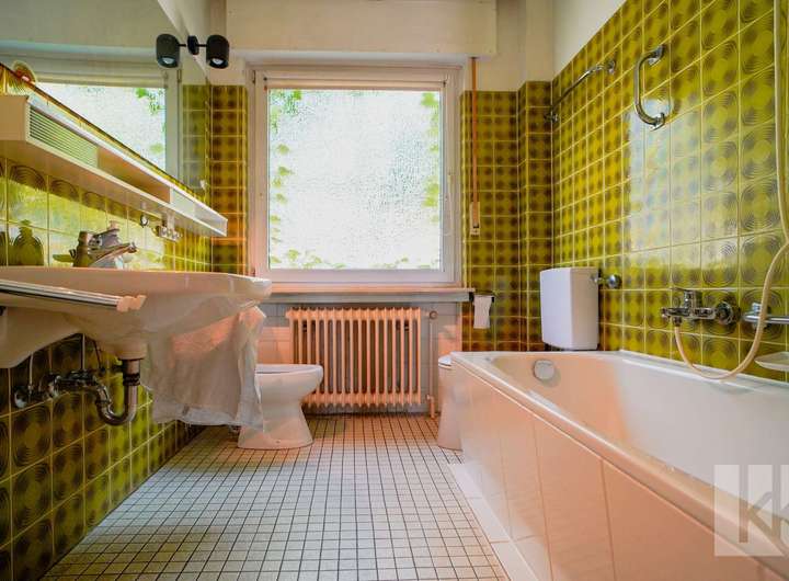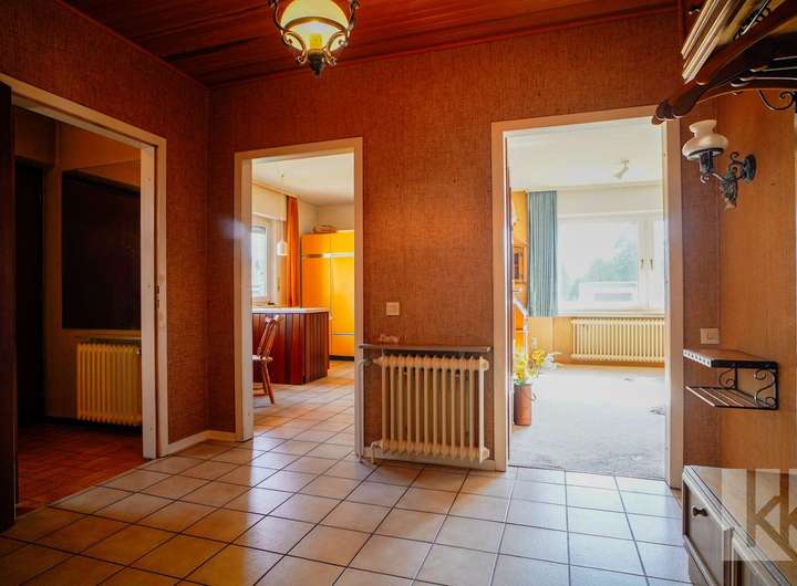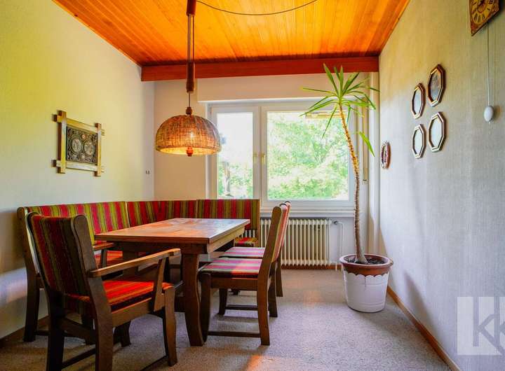 Schon beim Betreten des Hauses empfängt Sie ein kleiner Windfang mit Gäste-WC – praktisch und einladend. Dahinter öffnet sich eine geräumige Küche mit nostalgisch anmutender Einbauküche, die echten Retro-Charme versprüht. Der anschließende Wohnbereich mit Zugang zur Terrasse bildet das Herzstück des Hauses: Hell, gemütlich und mit Blick in den großzügigen Garten, der zu entspannten Stunden im Freien einlädt.