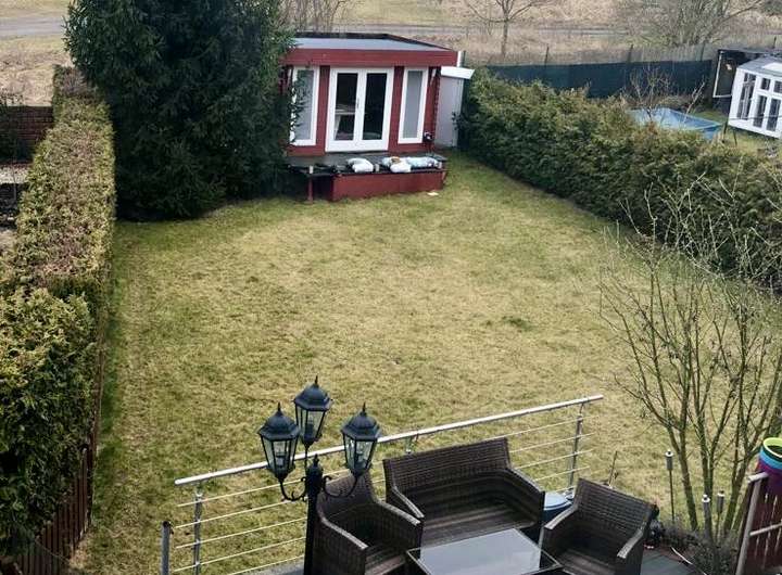 Von der Terrasse aus gelangen Sie direkt in den Garten. Ein Gartenhäuschen ergänzt das Angebot und kann unter anderem als praktischer Stauraum dienen.