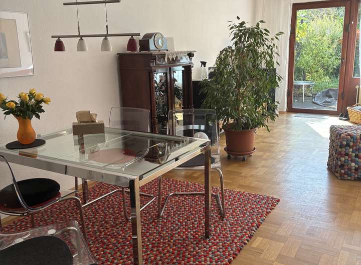 Das Wohn-Esszimmer ist mit Parkett ausgelegt und führt in den zum Haus gehörenden Garten,mit Südwestlage.