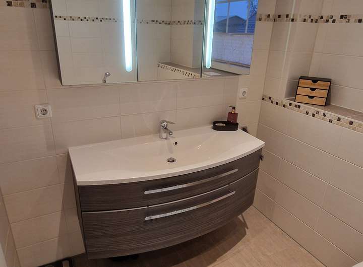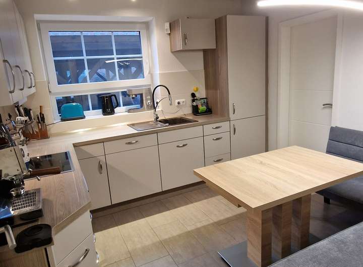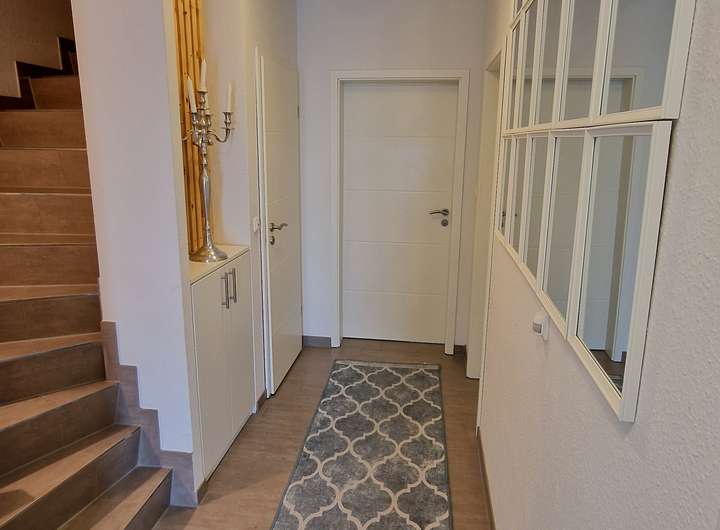 Das Haus verfügt über 5 Zimmer. Im Erdgeschoss befindet sich das großzügige Wohnzimmer, ein Badezimmer mit Dusche, ein Abstellraum und die Küche, die direkt an den Hauswirtschaftsraum grenzt. In der Küche ist eine Einbauküche mit Markengeräten inkl. Kühlschrank, Ofen mit Cerankochfeld, Dunstabzugshaube und Geschirrspüler verbaut.