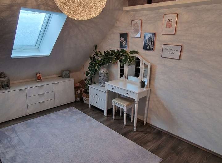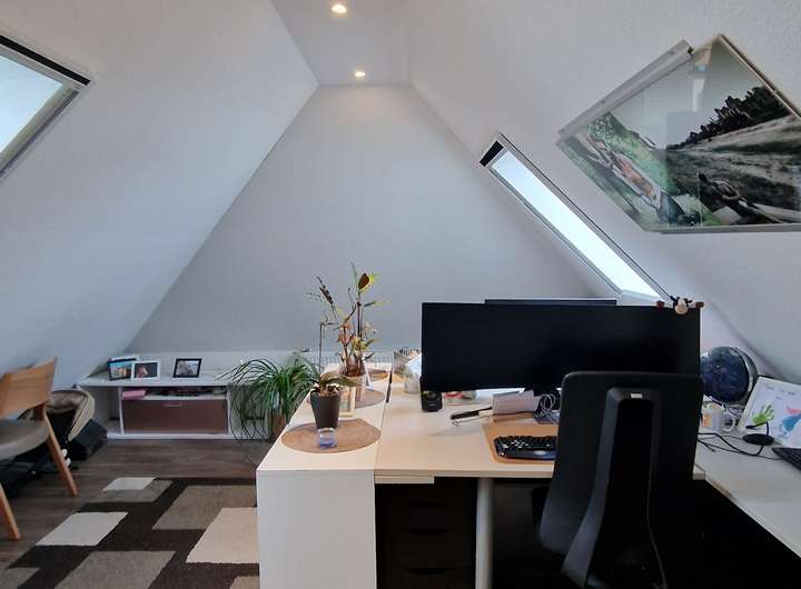 Im 1. OG befinden sich 3 Schlafzimmer und ein Vollbad. Das Dachgeschoss ist ebenfalls ausgebaut und wird derzeit als Büro genutzt. Das gesamte Objekt ist Alarmgesichert.