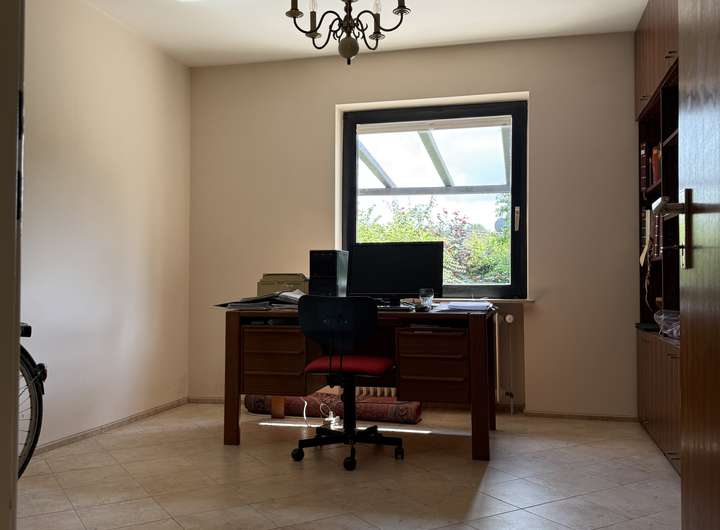 Das Haus verfügt im Erdgeschoss über ein geräumiges Wohnzimmer (Südausrichtung) mit großer Sonnenterrasse, eine integrierte Essecke, eine Küche mit Einbauküche, ein Gäste-WC, sowie 1 Büroraum / Schlafzimmer. Im Obergeschoss befinden sich ein Badezimmer, zwei Schlafzimmer und eine geräumige Diele. Ein Dachboden, über eine Luke erreichbar, bietet weiteren Stauraum, nicht als Wohnraum nutzbar. Außerdem gibt es einen Keller mit 2 Kellerräumen (nicht ausgebaut), Waschmaschinenbereich, und Heizungskeller. Das Grundstück umfasst ca. 500m2, ist pflegeleicht gestaltet, und wird auf Wunsch durch einen Gärtner gepflegt (nicht in den Nebenkosten aufgeführt). Zwei Außenstellplätze, zwei Terassen und ein Gartenschuppen sind vorhanden.