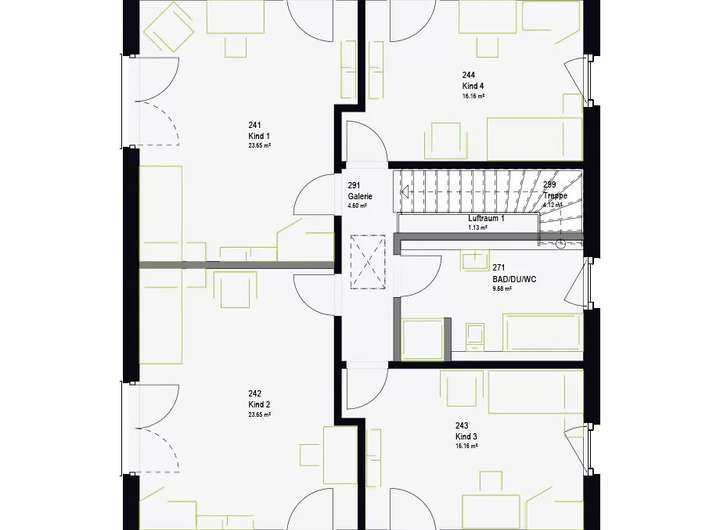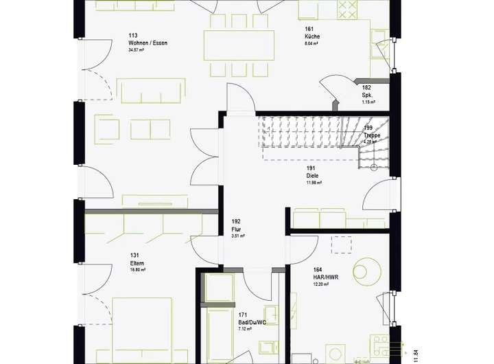 Ein besonderes Highlight ist die flexible Gestaltung des Elternschlafzimmers: Dieses kann sowohl im Erdgeschoss als auch im Obergeschoss realisiert werden. Der jeweils alternative Raum im Erdgeschoss eignet sich ideal als Büro, Gästezimmer oder zusätzlicher Rückzugsort – perfekt anpassbar an unterschiedliche Lebensphasen.