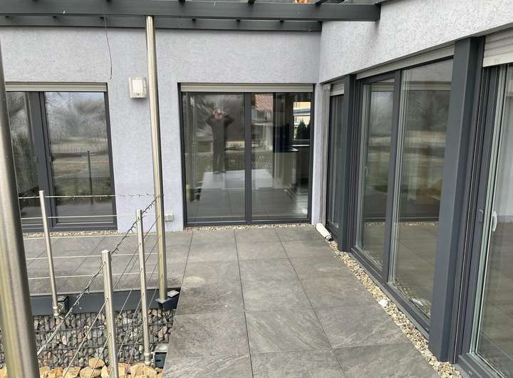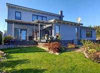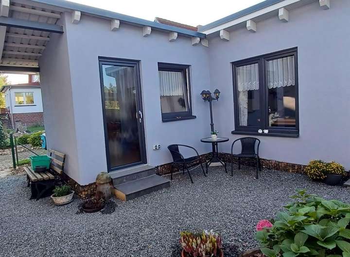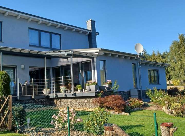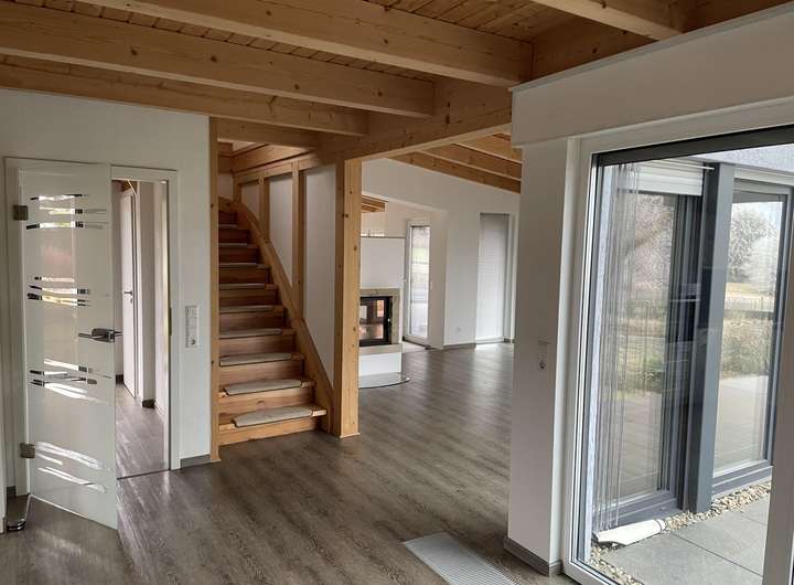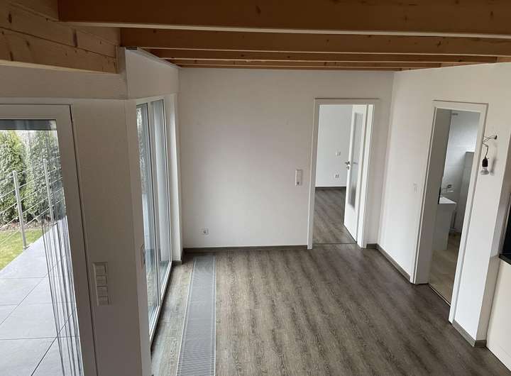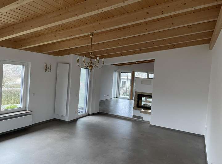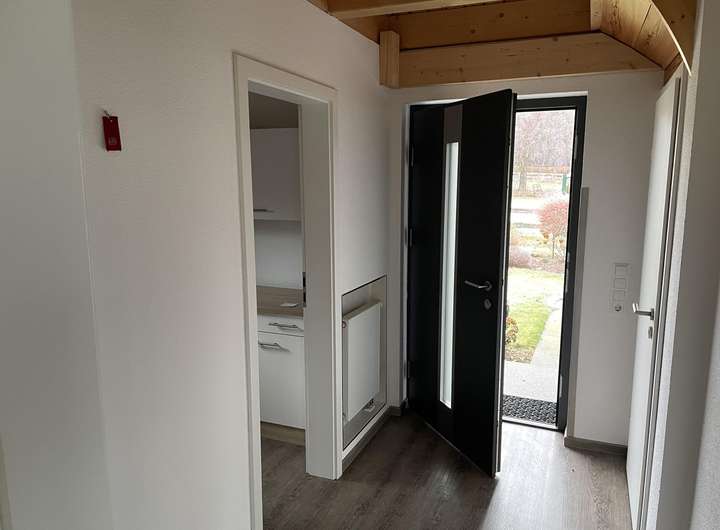 Das Einfamilienhaus wurde 2017 erbaut. Im Erdgeschoss befindet sich ein großes Wohnzimmer mit Kamin, angrenzendes, offenes Esszimmer mit offener Küche sowie ein Bad und ein Schlafzimmer. Esszimmer und Schlafzimmer verfügen über einen Zugang zu einer modernen Terrasse.