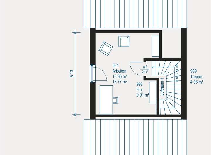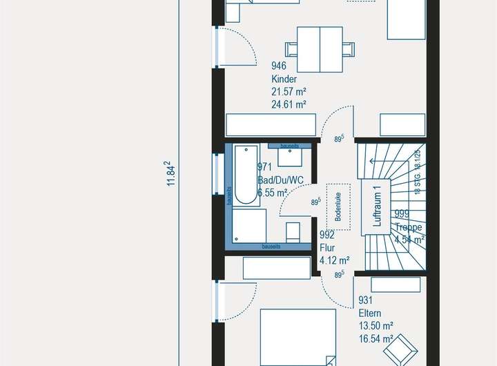 Eine elegante, gewendelte Treppe führt ins Obergeschoss, wo drei Schlafzimmer ausreichend Platz für die gesamte Familie bieten. Durch die standardmäßig integrierte Be- und Entlüftungsanlage ist jede Räumlichkeit optimal klimatisiert und stets mit frischer Luft versorgt, was zu einem erholsamen Schlaf beiträgt.
