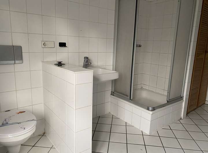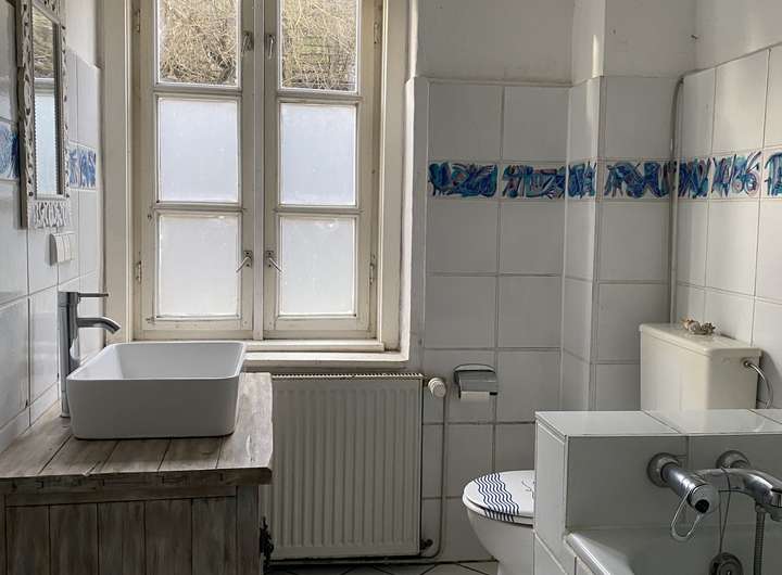 2 großzügige Zimmer (eines davon mit Kaminanschluss), Wannenbad, Küche, HWR, Abstellraum und Flur mit Ausgang zum Hof/ überdachte Terrasse