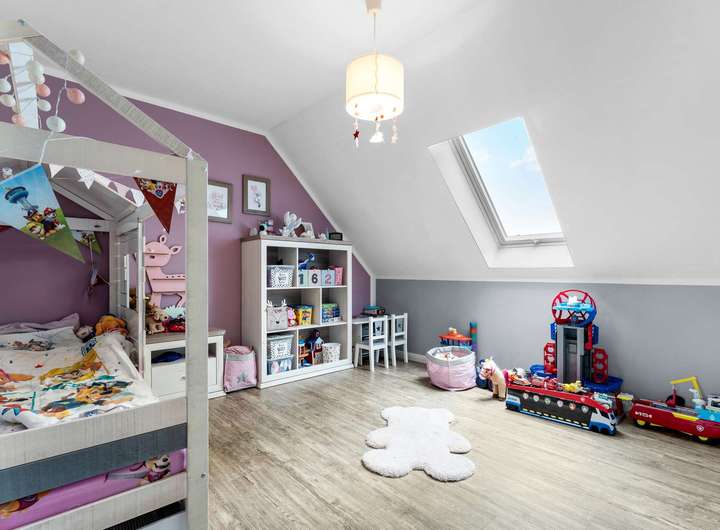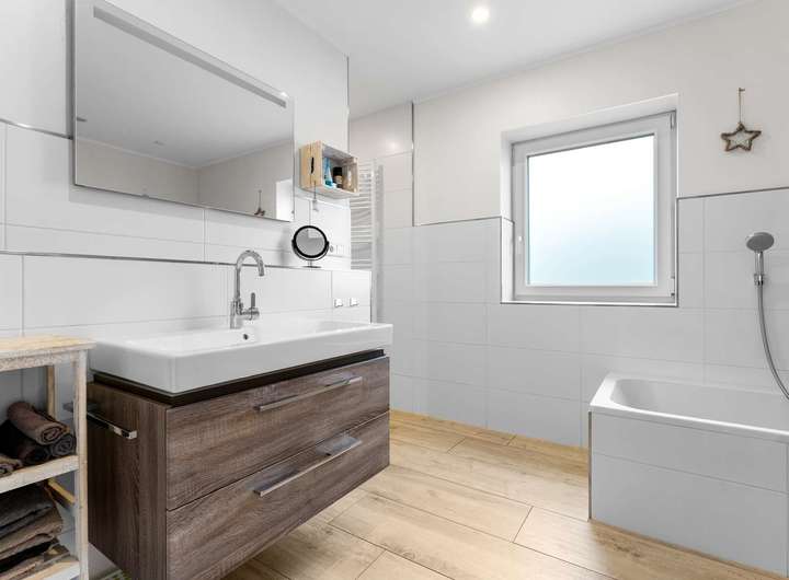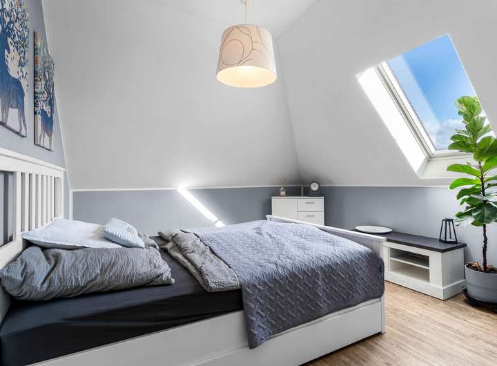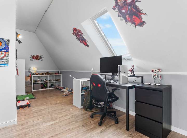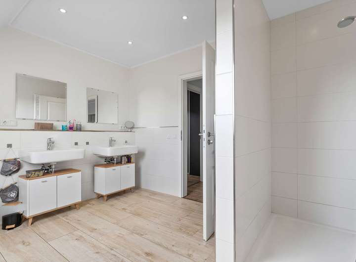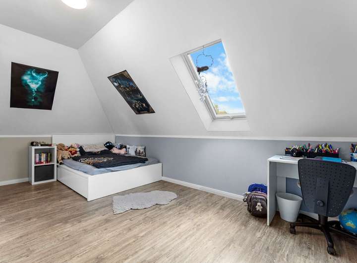 Über die elegante Holztreppe erreichen Sie das Dachgeschoss mit vier gut geschnittenen Schlafzimmern, die vielfältige Nutzungsmöglichkeiten bieten – ob Kinder-, Arbeits- oder Gästezimmer. Das moderne Familienbad verfügt über eine bodengleiche Dusche und überzeugt mit stilvollen Materialien und einem großzügigen Schnitt. Große Fenster lassen viel Licht herein und eröffnen den Blick in die Natur.