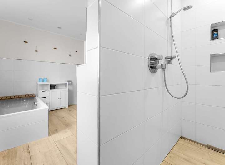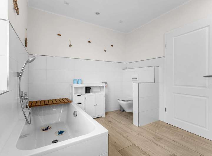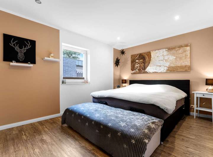 Ein weiteres Highlight im Erdgeschoss ist das geräumige Schlafzimmer mit eigener Ankleide und einem angeschlossenen Badezimmer, ausgestattet mit Walk-in-Dusche und Badewanne. Damit ist komfortables Wohnen auf einer Ebene problemlos möglich – ideal für Familien oder Mehrgenerationenhaushalte.