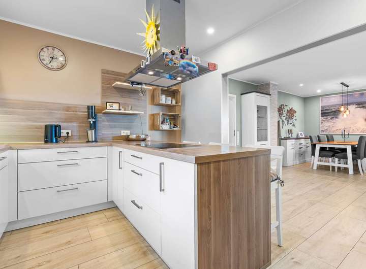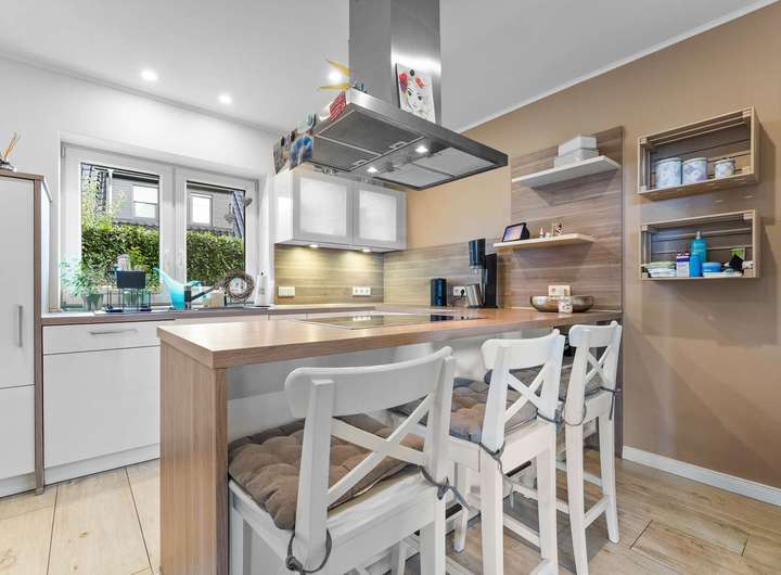 Die Küche ist ein echtes Highlight: Die hochwertige Nolte-Einbauküche mit modernen Elektrogeräten und Frühstückstresen lässt keine Wünsche offen – hier werden Kochen und Kommunikation eins. Direkt angrenzend befindet sich der Hauswirtschaftsraum mit Zugang zum überdachten Stellplatzbereich – praktisch und komfortabel, um Einkäufe oder Kinder bei jedem Wetter bequem ins Haus zu bringen.