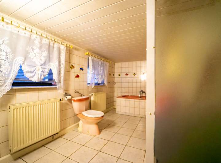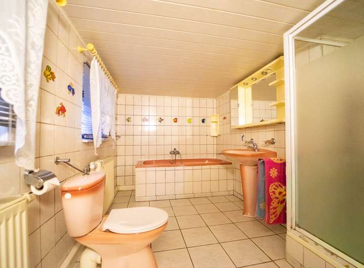 Im Erdgeschoss befindet sich das Tageslichtbad mit Wanne und Dusche, das den idealen Ort für Entspannung nach einem langen Tag bietet. Helle Fliesen und die natürliche Belichtung schaffen eine freundliche Atmosphäre, in der sich Funktionalität und Wohlgefühl verbinden. Ein separates WC ergänzt das Raumangebot und sorgt für zusätzlichen Komfort – besonders praktisch für Familien oder Gäste.