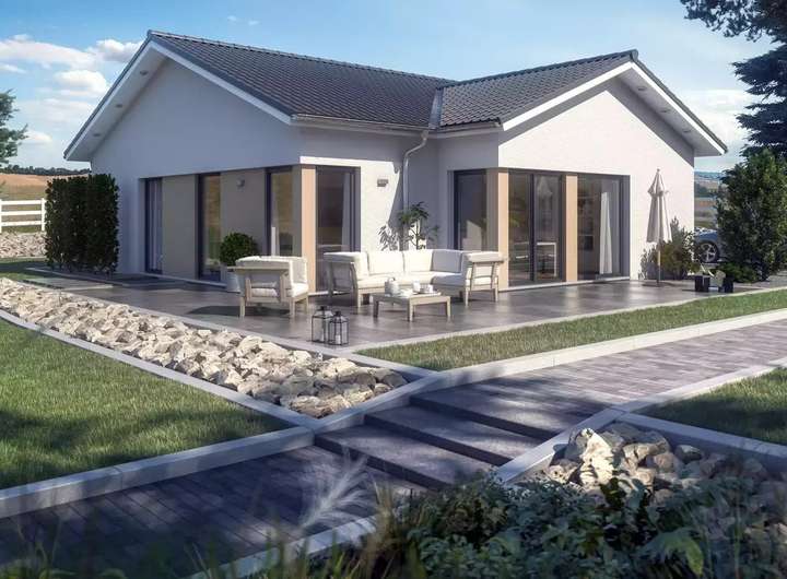 Nicht nur ältere Menschen wissen die Vorteile des ebenerdigen Wohnens zu schätzen. Auch immer mehr jüngere Familien genießen den Komfort, den ein Bungalow bietet. Das betrifft nicht nur das barrierefreie Wohnen ohne Treppen, sondern auch die individuellen Gestaltungsmöglichkeiten. Da statisch kein zweites Geschoss beachtet werden muss, lassen sich die Räume in einem Bungalow frei anordnen. Ein besonders beeindruckendes Raumgefühl entsteht, wenn die einzelnen Bereiche nahtlos miteinander verschmelzen. So wie beim Entwurf AMBIENCE 88. Das Herz des Hauses schlägt im großzügig dimensionierten Wohn-, Ess- und Kochbereich, der mit einem offenen, sehr breiten Durchgang an die Diele anschließt. Dank des Querhauses findet neben der Küche auch eine kleine Speisekammer Platz, in der die Vorräte ordentlich verstaut werden können. So bleiben die Küchenschränke frei für Geschirr, Töpfe und Pfannen. Üppige Fensterflächen lassen große Mengen Tageslicht ins Innere strömen und sorgen so für ein luftig-leichtes Ambiente. Gegenüber der Gemeinschaftsbereiche, die sich zur sonnigen Südseite orientieren, befinden sich die Privaträume. Bestehend aus einem großen Schlafzimmer, einem Kinderzimmer und einem Bad mit Wanne und Dusche orientieren sie sich an den Wohnbedürfnissen einer dreiköpfigen Familie. Später, wenn der Nachwuchs flügge geworden ist, lässt sich der zusätzliche Raum als helles Büro oder auch als Hobbybereich einrichten. Den eigenen Ideen sind hier keine Grenzen gesetzt. Zusätzlich finden auf der Wohnfläche von mehr als 96 m² noch ein Garderobenbereich, eine Gästetoilette und ein Technik- bzw. ein Hauswirtschaftsraum Platz. Auf ein Untergeschoss kann damit komplett verzichtet werden. Auch optisch kann der Bungalow punkten. Egal, ob in der Stadt oder auf dem Land: Mit seinem modern interpretierten Satteldach fügt sich das Fertighaus harmonisch in jedes Baugebiet ein. Eine individuelle Note erhält es durch das Querhaus. In den Winkel schmiegt sich eine gemütliche Terrasse, die über raumhohe Fenstertüren betreten werden kann. Akzente setzen zudem die beige abgesetzten Fassadenflächen zwischen den Fenstern.