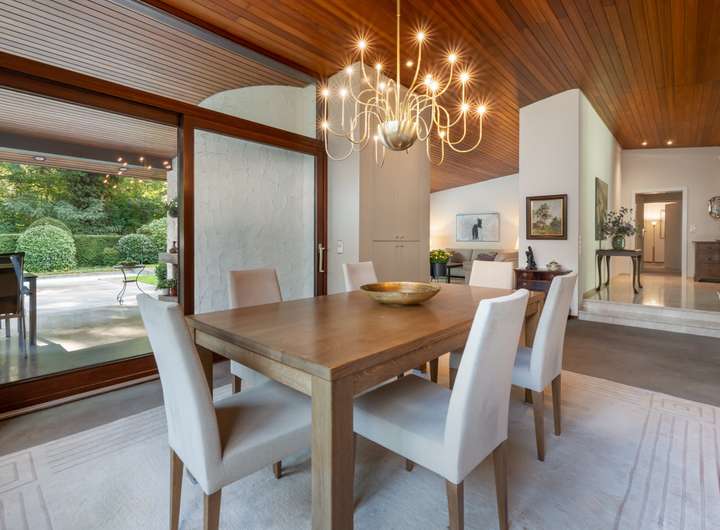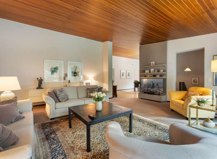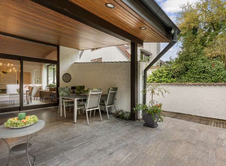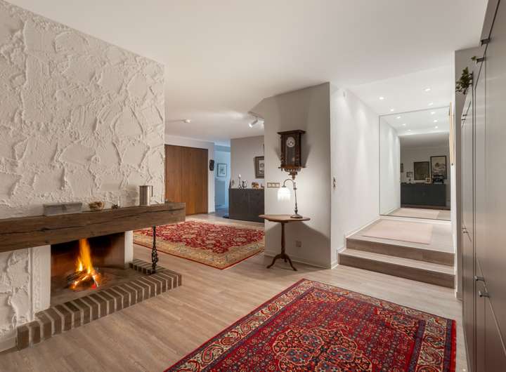 Geradeaus führt der Weg in den weitläufigen Wohn- und Essbereich. Große Fensterflächen holen viel Licht in den Raum und öffnen den Blick auf den Garten. Der Kamin gliedert den Bereich und sorgt in den Wintermonaten für angenehme Wärme. Der Essplatz ist so positioniert, dass Sie ihn im Sommer unmittelbar mit der angrenzenden Terrasse und dem Garten verbinden können. Der Blick fällt direkt auf den Pool – ein klarer Mittelpunkt für Freizeit und Erholung.