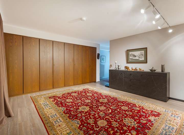 Im Untergeschoss befinden sich der Heizungsraum und der Hauswirtschaftsraum. Hinzu kommen ein großer Abstellraum sowie ein großzügiger Hobbyraum mit Kamin. Ein weiteres Zimmer eignet sich als Gästezimmer oder Büro. Zwei Badezimmer ergänzen diese Ebene sinnvoll.