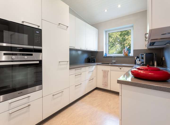 Links von der Diele befindet sich die Küche. Sie ist funktional angebunden und verfügt über eine Speisekammer, die zusätzlichen Stauraum bietet. Nebenan liegt ein Arbeitszimmer, das sich ideal als Homeoffice oder Gästezimmer nutzen lässt. Die Nähe zur Küche und zum Wohnbereich schafft eine gute Integration, gleichzeitig bleibt die nötige Ruhe gewahrt.
