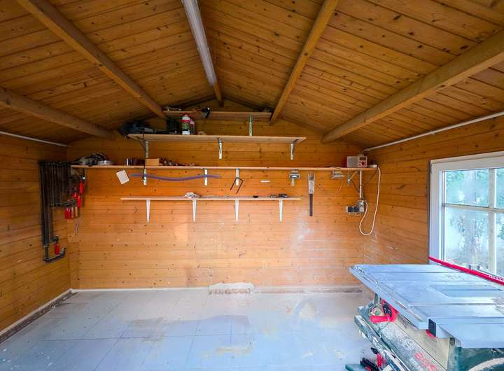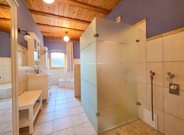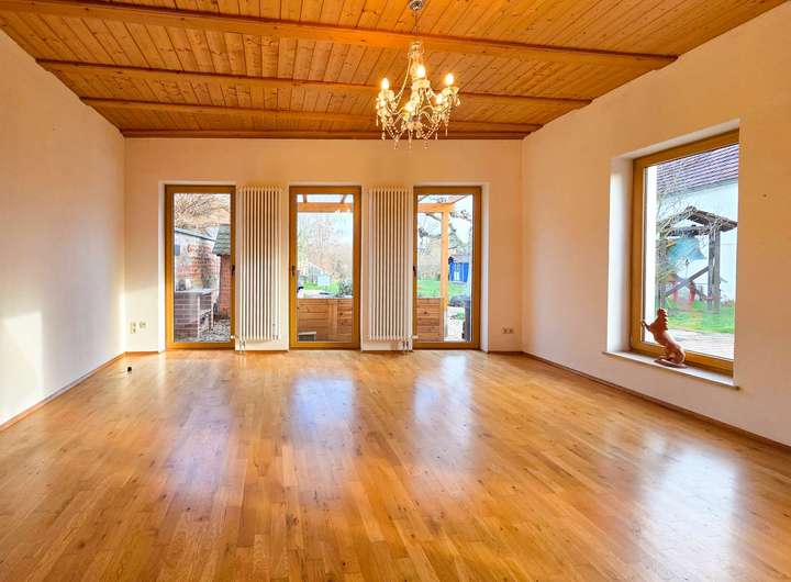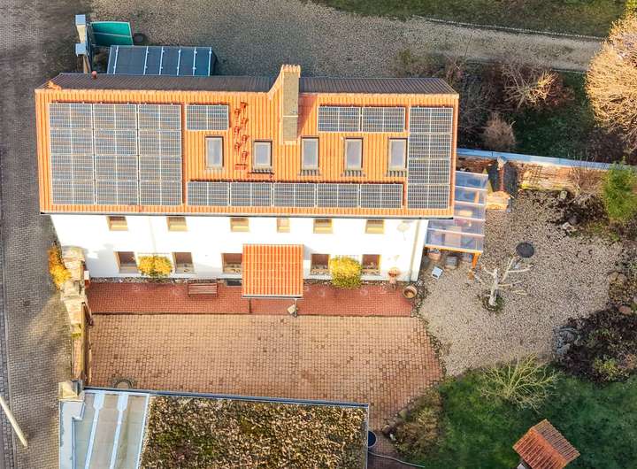 Ausgestattet ist die Immobilie u. a. mit Gaszentralheizung (2004), Photovoltaikanlage mit Speicher (2020), Zisterne, Brunnen mit Beregnungsanlage, Saunahäuschen sowie Garage, Werkstatt, Doppelcarport und Außenstellplätzen. Küche und Bad wurden 2022 erneuert. Glasfaser liegt an der Straße an.