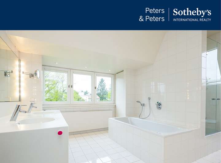 Granitboden, Parkett, Bulthaup Einbauküche mit Miele und Gaggenau Geräten, hohe Decken (ca. 3,20m), große Fensterflächen, Schiebetüren, elektrische Rollläden in EG und OG, zwei Balkone, eine riesige Terrasse, zwei Gäste WC, zeitloses sehr hochwertiges Badezimmer mit Carrara Marmor ausgelegt, Ankleide mit Vollholzschränken, zahlreiche Einbauschränke bzw. Einbauregale, Gästebereich im Sous-terrain-Bereich des Kellers mit Wohn-/Schlafzimmer (keine Wohnfläche jedoch mit Wohnraumqualität), Küche und vollwertigem Badezimmer mit Dusche und Badewanne, Saunabereich mit Tauchbecken und bodengleicher Dusche, parkähnlich und sehr schön eingewachsener Garten mit Gartenbeleuchtung, Doppelgarage mit elektrischem Tor