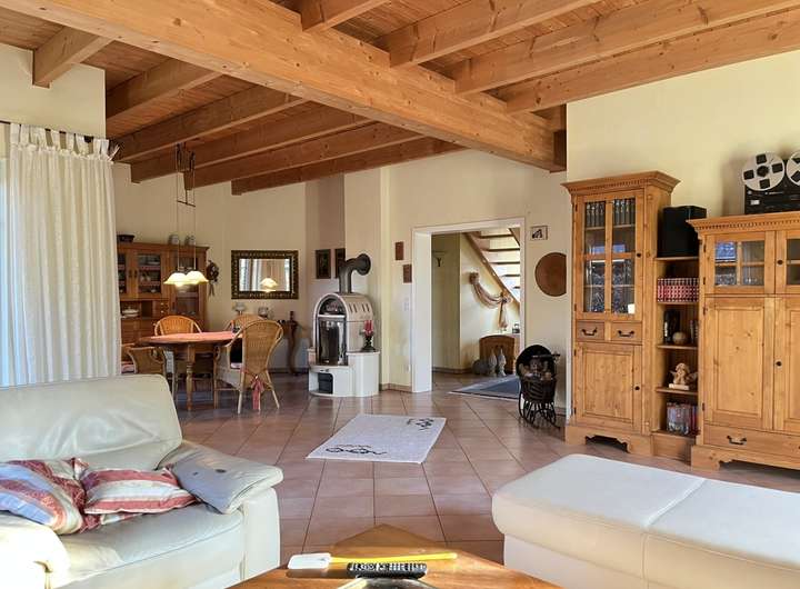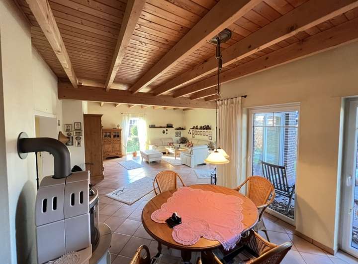Geradeaus öffnet sich der großzügige Wohn- und Essbereich mit einer charaktervollen Holzdecke und sichtbaren Balken, die dem Raum eine warme Atmosphäre verleihen. Der Kamin bildet den Mittelpunkt und lädt zu gemütlichen Stunden ein. Bodentiefe Fenster und der direkte Zugang zur Terrasse sorgen für viel Tageslicht und eine angenehme Verbindung zum Außenbereich. Der Wohn- und Essbereich ist – wie das gesamte Erdgeschoss – pflegeleicht gefliest.