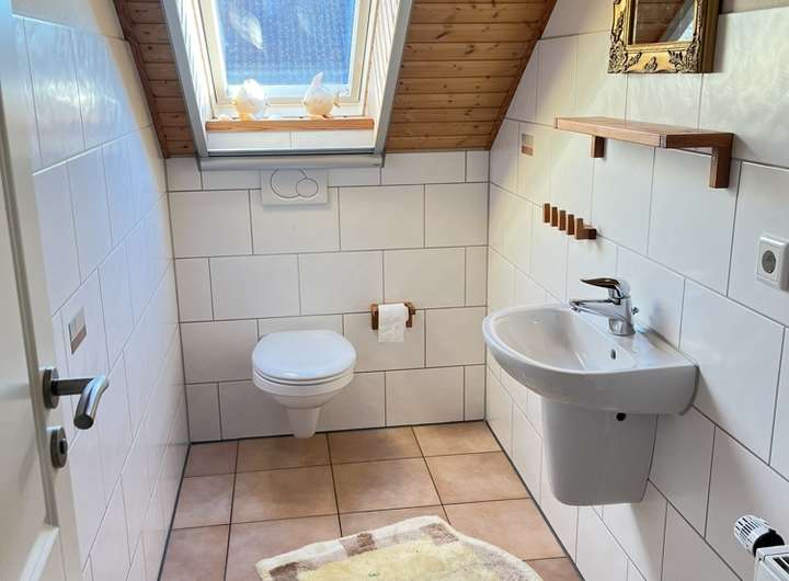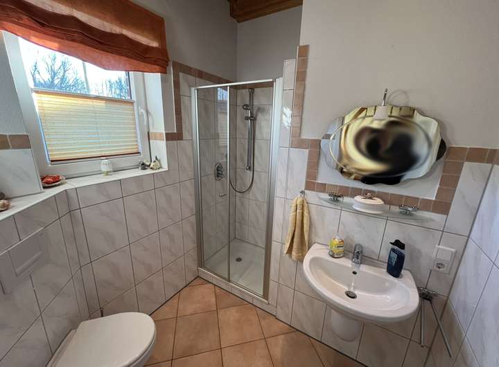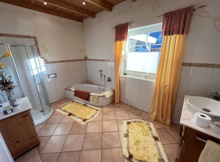 Besonders hervorzuheben ist die komfortable Badausstattung im Erdgeschoss: Neben einem Gäste-WC mit Dusche steht ein zweites, vollwertiges Badezimmer mit Badewanne zur Verfügung. Diese durchdachte Aufteilung bietet sowohl im Alltag als auch bei Besuch ein hohes Maß an Flexibilität.