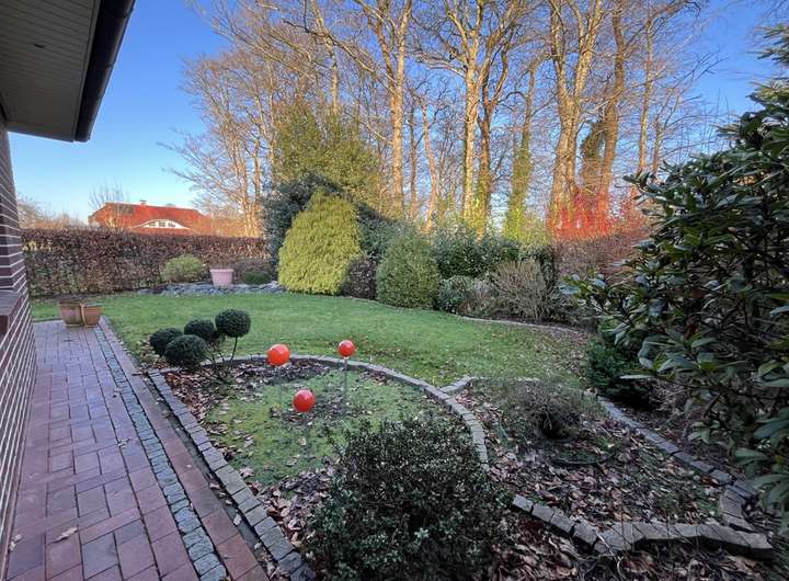 Der rundum gepflegte Garten mit Terrassenbereich lädt zum Verweilen ein und bietet ausreichend Platz für Erholung, Hobby oder geselliges Beisammensein – eine grüne Oase mit viel Privatsphäre.