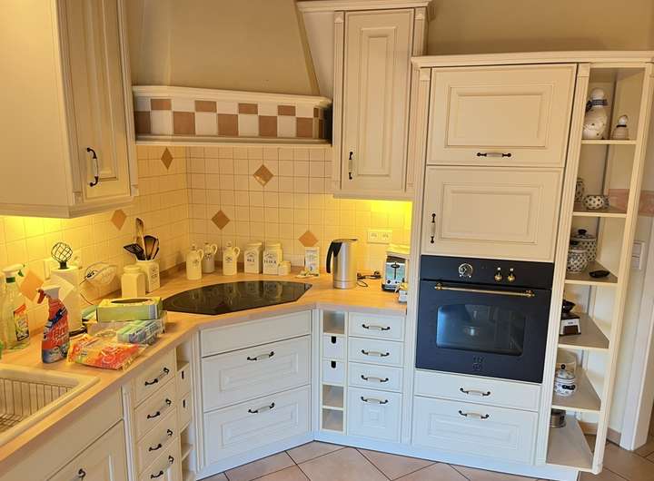 Die hochwertige Einbauküche ist funktional und geschmackvoll gestaltet und verfügt über einen direkten Ausgang nach draußen –