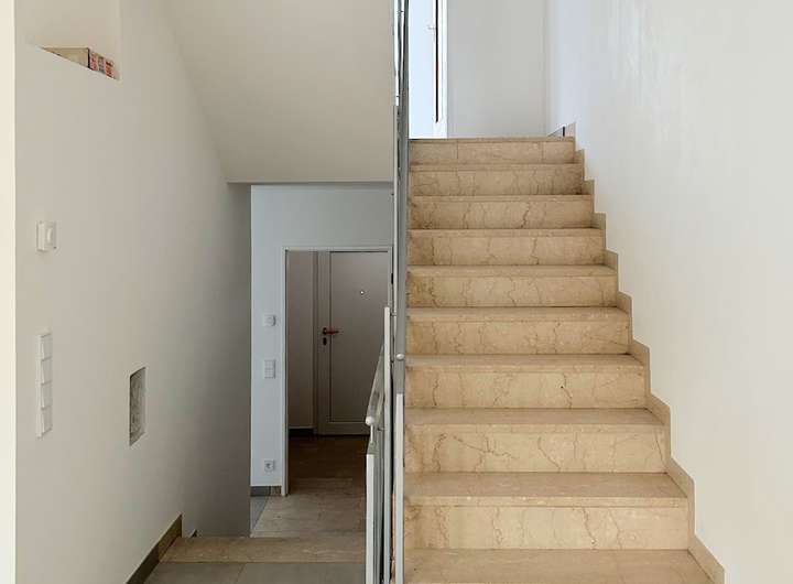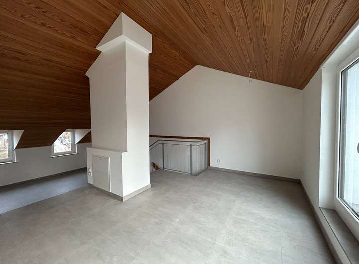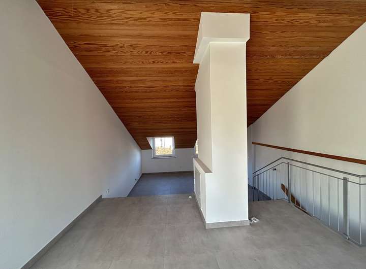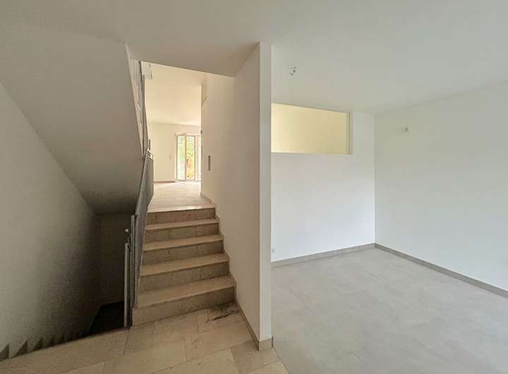 Im Erdgeschoss befindet sich die Küche und das Gäste-WC, über 5 Stufen erreicht man das Wohnzimmer. Von dort gelangt man auf die Terrasse sowie in den Garten. Im ersten Stock liegen das Badezimmer mit moderner begehbarer Dusche sowie drei Zimmer, eins Richtung Straße sowie zwei (durch eine Schiebetür abgetrennt) mit Blick auf den Garten und Balkon. Zusätzlich gibt es hier einen Abstellraum. Im zweiten Stock befindet sich ein heller und sehr großzügig geschnittener Loft mit Loggia.