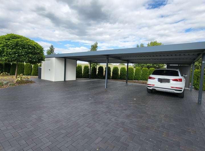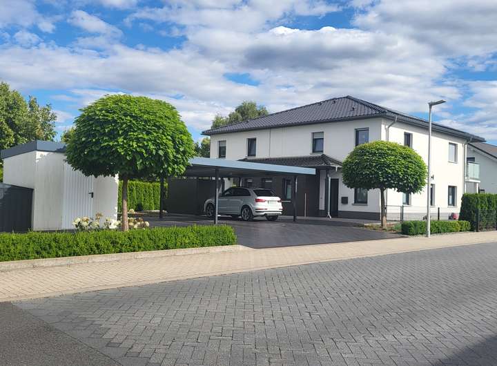 Außenbereich: Grundstück ca. 345 m², Doppelcarport inklusive, hochwertiges Klinkerpflaster, Doppelstabmattenzaun, umlaufende Hecke, Vorgarten und gemeinschaftliches Gartenhäuschen. Die Doppelhaushälfte liegt auf einem Eckgrundstück mit nur einem direkten Nachbarn.