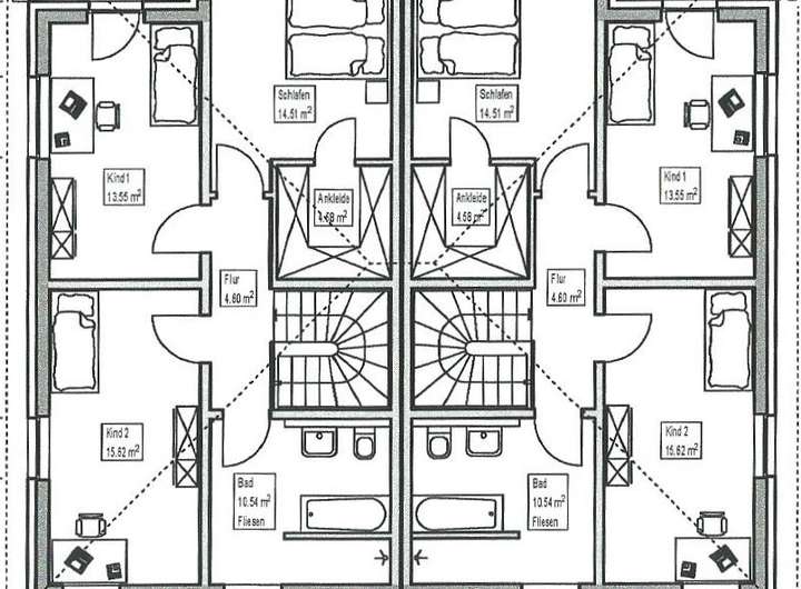Im Obergeschoss liegen ein modernes Bad mit Wanne und ebenerdiger Dusche, zwei Kinderzimmer, ein Elternschlafzimmer mit Ankleide sowie ein Südbalkon, zugänglich vom Eltern- und einem Kinderzimmer.