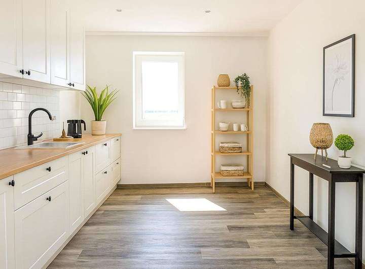 Die Küche ist großzügig geschnitten. Hier können Sie gemeinsam kochen und die Vorbereitung von Mahlzeiten wird zum Vergnügen. Auch hier gibt es Platz für einen Esstisch.