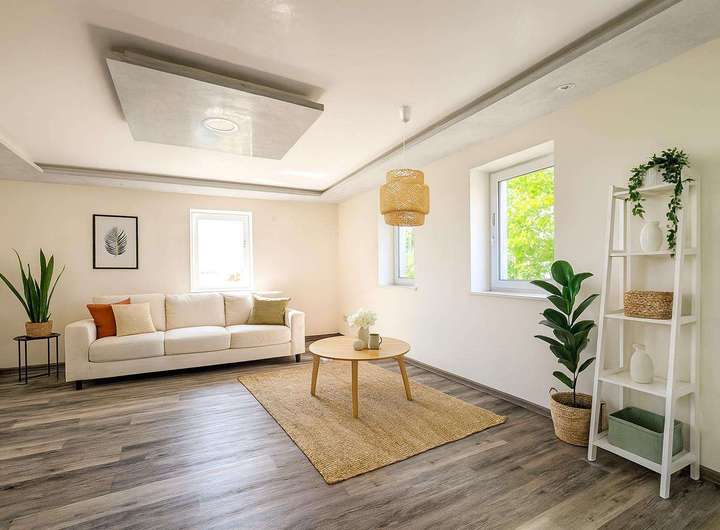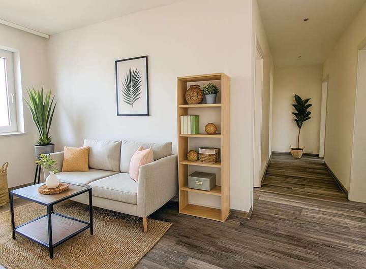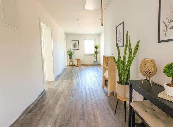 Die Wohnung betreten Sie über den weitläufigen Flur, der ebenfalls als Essbereich genutzt werden kann. Das helle und einladende Wohnzimmer bietet viel Platz für gemütliche Abende mit Familie und Freunden. Die Fenster lassen viel Tageslicht herein und schaffen eine angenehme Atmosphäre.
