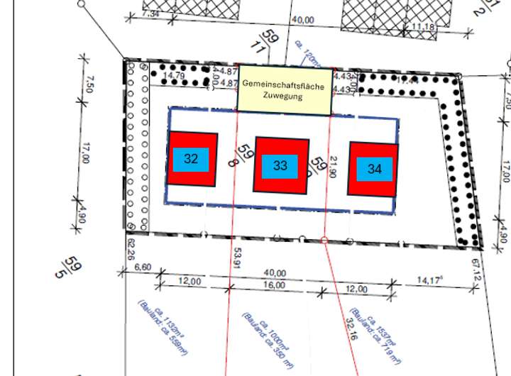 Das Baugrundstück 59/10 umfasst nach Neuvermessung eine Fläche von ca. 1.537 m² sowie eine gemeinsame Zufahrtsfläche ( Flurstück 59/11).