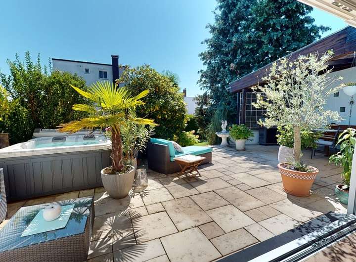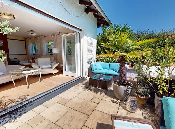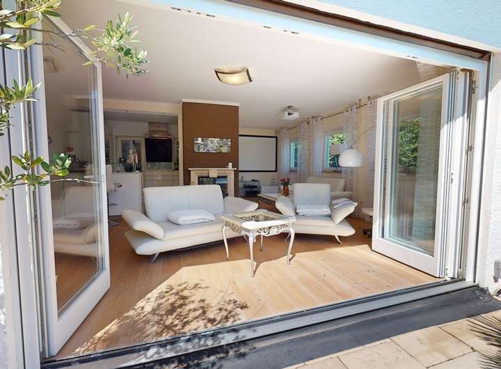 Über den Wohnbereich gelangen Sie direkt auf die Terrasse – ein echtes Highlight des Hauses. Hier eröffnet sich ein privater Außenbereich, der perfekt geeignet ist, um die ruhige Lage zu genießen, Gäste zu empfangen oder den Feierabend im Freien ausklingen zu lassen.