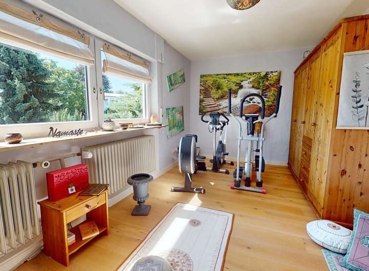 Das Erdgeschoss bietet eine harmonische Kombination aus Funktionalität und Komfort. Zwei großzügig geschnittene Zimmer eröffnen flexible Nutzungsmöglichkeiten – ob als Gäste-, Arbeits- oder Jugendzimmer. Ergänzt wird diese Ebene durch ein voll ausgestattetes Badezimmer, ein separates WC sowie einen praktischen Abstellraum, der zusätzlichen Stauraum schafft. Eine kompakte, gut integrierte Küche rundet das Erdgeschoss ab und macht es ideal für ein Mehrgenerationenkonzept oder getrennte Wohnbereiche.