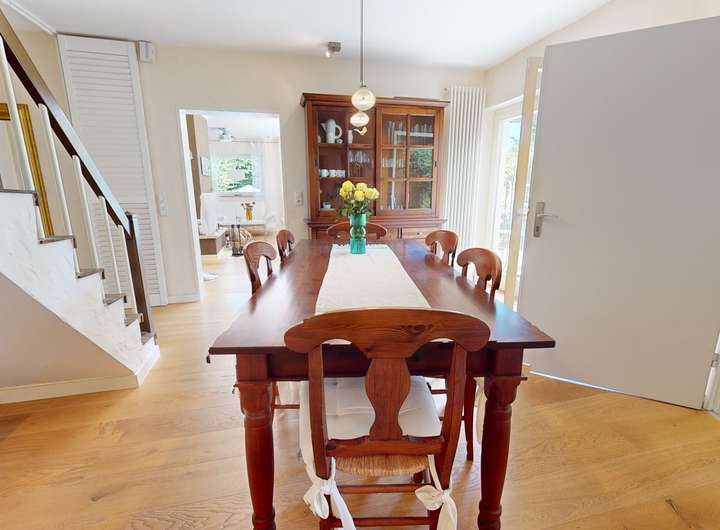 Das erste Obergeschoss ist das Herzstück des Hauses und präsentiert sich als repräsentative Wohnebene mit offenem, lichtdurchflutetem Charakter. Der einladende Essbereich bildet den Mittelpunkt des Familienlebens. Drei ruhige, hochwertig ausgestattete Schlafzimmer bieten genügend Raum für individuelle Rückzugsorte.