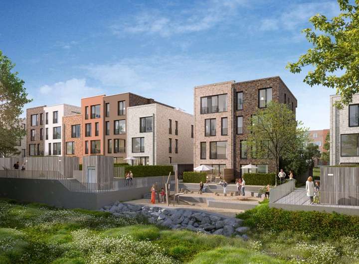Das Wohnquartier Jenfelder Au ist auf einem weiteren ehemaligen Kasernen-Gelände entstanden, das mehr als 2.000 Menschen in modernen und individuellen Stadthäusern sowie Geschosswohnungen ein neues Zuhause bietet, das Ganze umgeben von ansprechend gestalteten Parks und Wasserflächen.