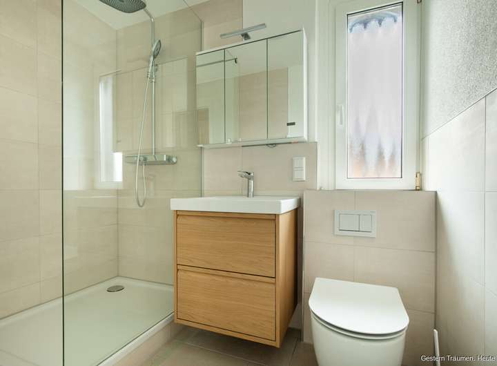 Im ersten Obergeschoss stehen zwei gut geschnittene Zimmer zur Verfügung, die sich flexibel als Schlaf-, Kinder- oder Arbeitszimmer nutzen lassen. Ergänzt wird diese Etage durch ein modernes Tageslichtbad mit Dusche, das im Rahmen der Kernsanierung vollständig erneuert wurde.