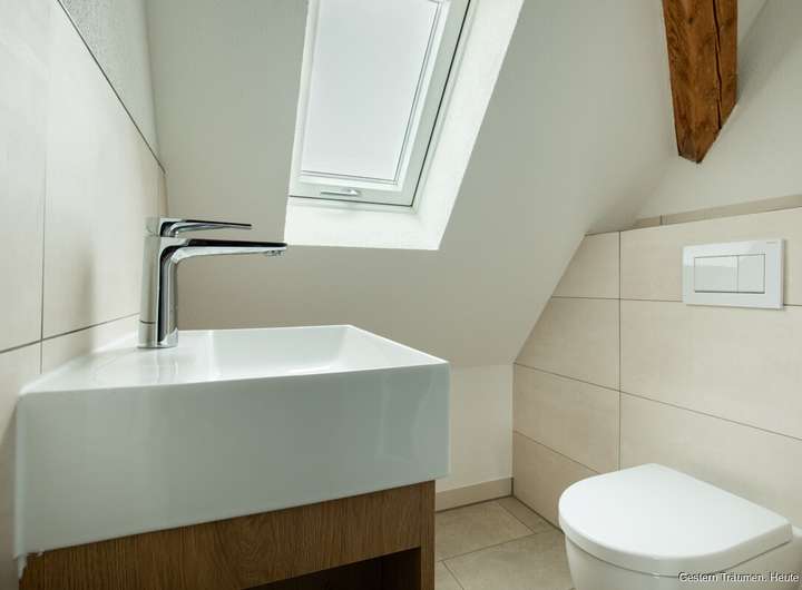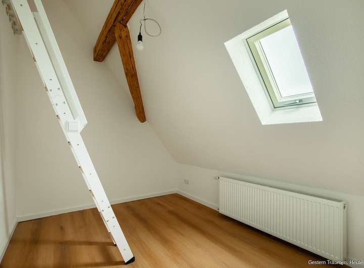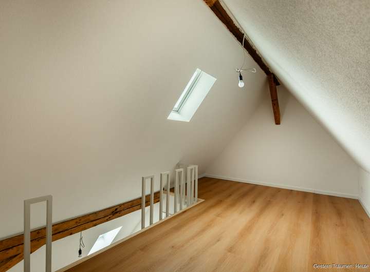 Das Dachgeschoss bietet zwei weitere Zimmer, von denen eines durch eine zusätzliche Empore ein besonderes Raumgefühl und vielseitige Nutzungsmöglichkeiten eröffnet. Zudem befinden sich auf dieser Ebene ein praktischer Abstellraum sowie ein separates WC, was den Wohnkomfort weiter erhöht.