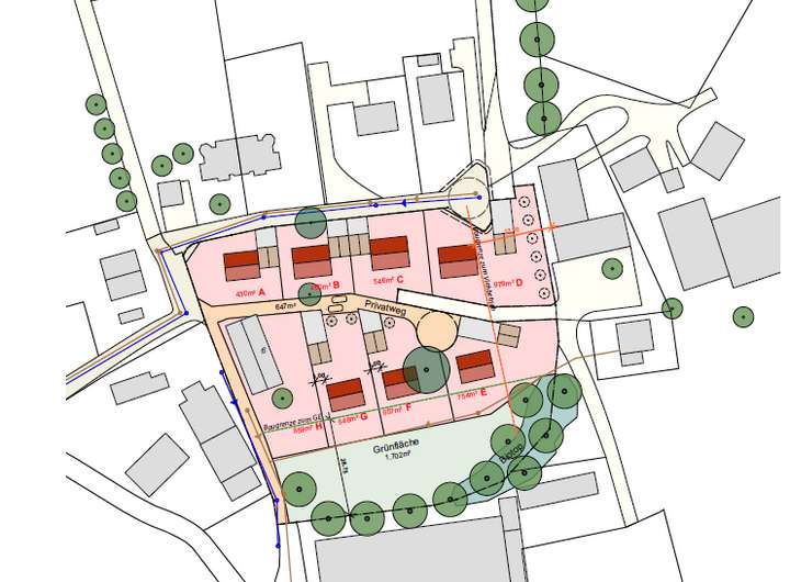 Im einem bereits bestehenden Baugebiet im „Dorfgebiet“ von Wolfsbach entstehen derzeit 7 Baugrundstücke, auf einer Fläche von ca. 4000 qm, sowie 3 Baugrundstücke für jeweils ein Tiny Haus auf einem Grundstück mit 850 qm
